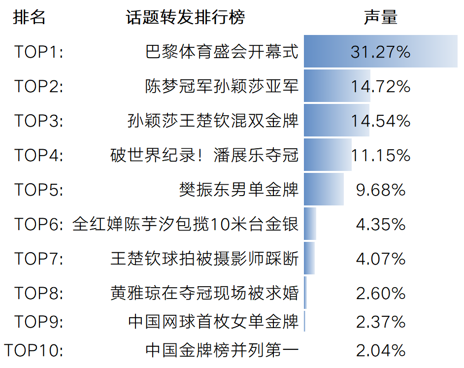 从发文话题分布情况来看,游泳、跳水、乒乓等多个项目以及全红蝉、樊振东、马龙、孙颖莎、潘展乐、郑钦文等优秀运动员成为大众话题焦点。“夺冠现场被求婚”“王楚钦球拍被踩”等赛事中很多小插曲也牵动着国人心